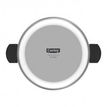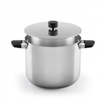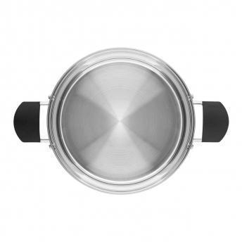 Asas y mangos integrados de silicona. Remaches de seguridad. Compatible con inducción y todo tipo de cocinas. Fácil de limpiar. Acabado interior brillante. Pomo de silicona. Indicador de capacidad. Estructura Trimetal Induction.
