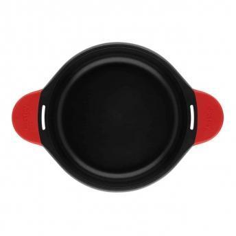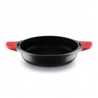 Tapadera con aro de silicona y salida de vapor oculta. Anti-adherente libre de PFOA. Cuerpo de aluminio fundido. Pomo de silicona. Asas fijas de silicona rojas. Base full induction.
