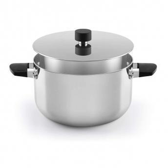 Asas y mangos integrados de silicona. Remaches de seguridad. Compatible con inducción y todo tipo de cocinas. Fácil de limpiar. Acabado interior brillante. Pomo de silicona. Indicador de capacidad. Estructura Trimetal Induction.