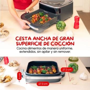 En su espaciosa cesta caben hasta 1 kg de patatas fritas, 25 muslitos de pollo, pizzas de 27 cm, 6 filetes de pescado, 12 galletas, 30 nuggets o 10 lonchas de bacon, ¡sin tener que apilar nada!