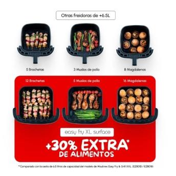 La Easy Fry XL Surface de Moulinex te permite cocinar una variedad de comidas rápidamente, desde 1 kg de patatas fritas hasta pizzas de 27 cm. Con un diseño compacto, ocupa poco espacio en la encimera y su ventana de visualización te deja controlar la cocción sin abrir la cesta.