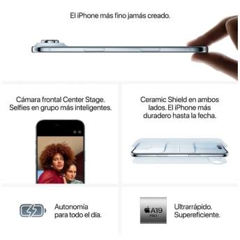MÁS RESISTENTE QUE CUALQUIER MODELO ANTERIOR —Su estructura está fabricada con titanio ultraligero. El Ceramic Shield protege la parte trasera del iPhone Air y la hace cuatro veces más resistente a las roturas. Mientras que el nuevo Ceramic Shield 2 de la parte delantera aguanta el triple frente a los arañazos.
