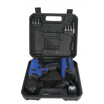 Viene equipado con un maletín de transporte rígido con mango en el que incorpora una batería de Li-ON 1,5 Ah con indicador de nivel de carga, un cargador, 6 Bits + Adaptador y 6 Brocas.